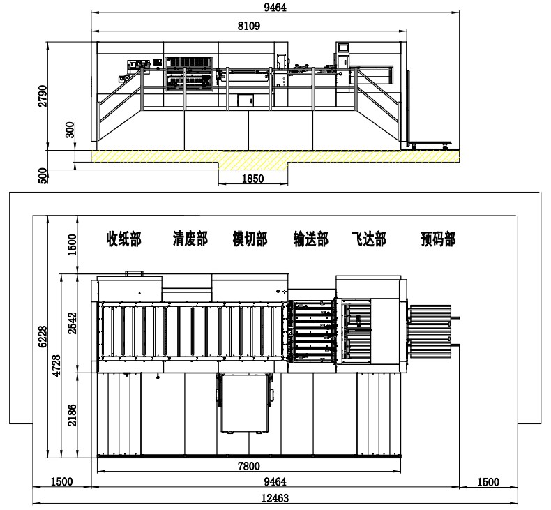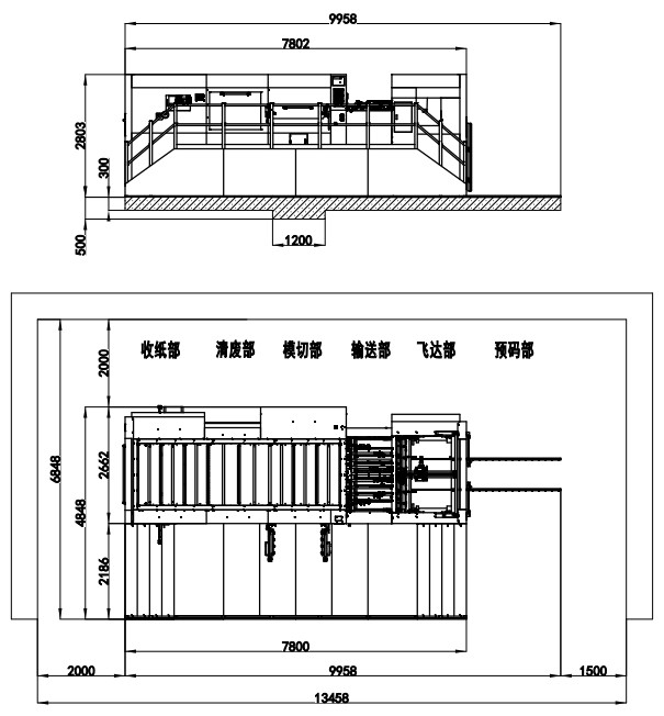 | 整機(jī)尺寸 (高堆卷簾式收紙) | 9551×4648×2767mm(L×W×H) (寬含腳踏板) | 9464×4728×2790mm(L×W×H) (寬含腳踏板) | 9958×4848×2803mm(L×W×H) (寬含腳踏板) | 10690×5296×2932mm(L×W×H) (寬含腳踏板) |
