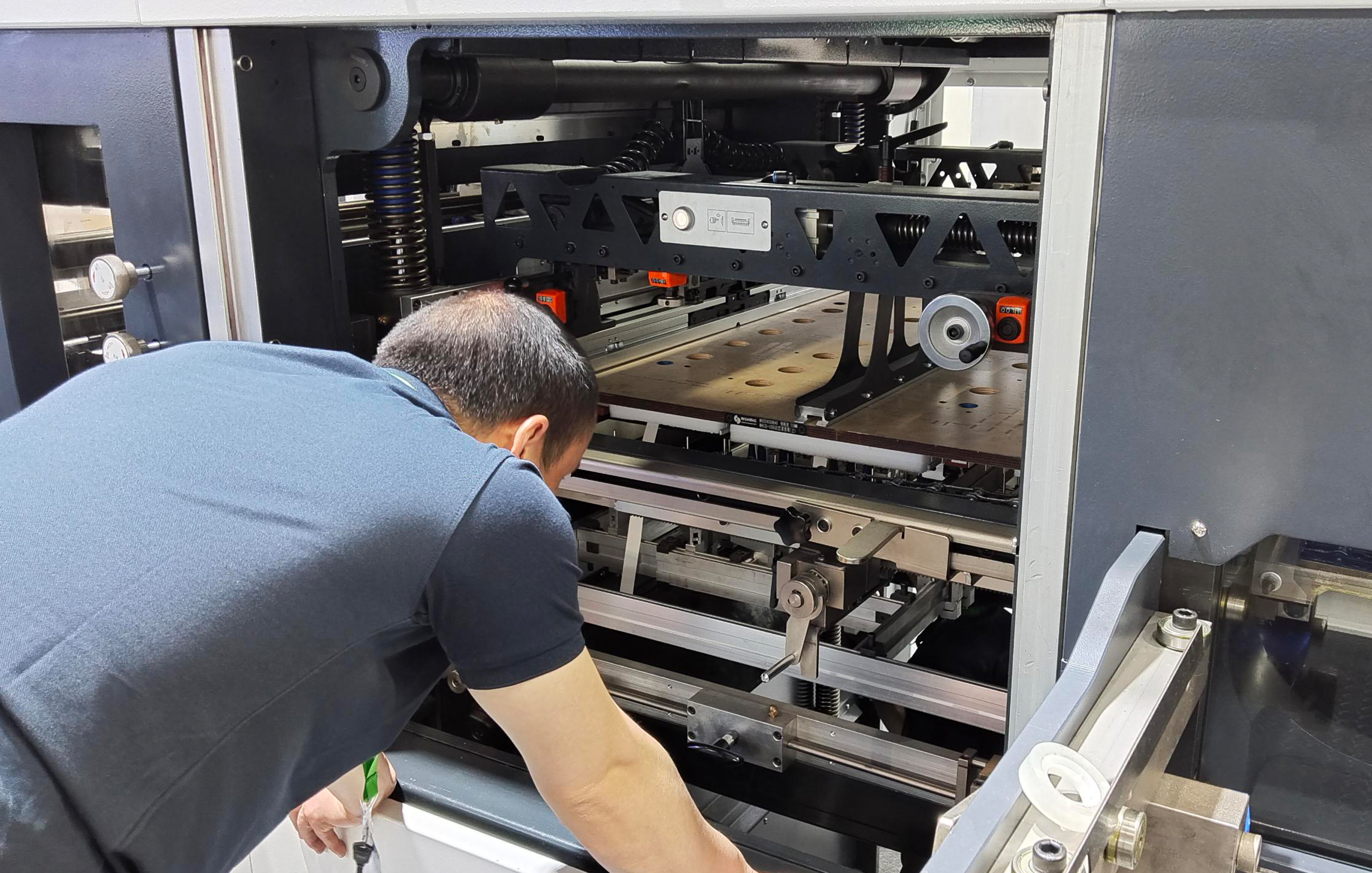 It is equipped with a feeder featuring four suction and six feeding functions and an ultrasonic double-sheet detection device, which effectively avoids problems such as double sheets and paper jams. The die cutting section applies the turbine variable speed transmission technology, enabling the moving platform to operate precisely at variable speeds, effectively reducing the defects of continuous dots and improving the die cutting quality. It is equipped with a quick fine-tuning plate frame and a fine-tuning cutting?plate, directly reducing the plate adjustment time by 50%. The gripper bar is made of flexible and durable carbon fiber material with small gripper nozzles.