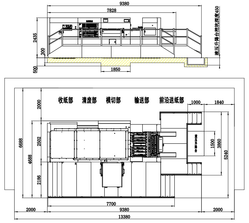 | Machine Dimension | 7810×4500×2350mm (L: paper prepared track included, W: platform included) | 8974×5240×2467mm(L: paper prepared track included, W: platform included) | 9380×5240×2435mm(L: paper prepared track included, W: platform included) | 9380×5240×2452mm(L: paper prepared track included, W: platform included) | 9964×5580×2582mm(L: paper prepared track included, W: platform included) |