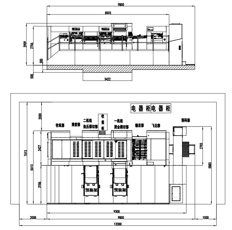 | Machine Dimensions(Including Die Preloader | 9800×7613×2909mm(L×W×H) (L: paper prepared track included, W: platform included) |